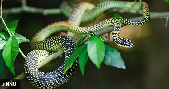 รู้จักกับ “งูต้นไม้” ชื่อวิทยาศาสตร์ Chrysopelea เป็นกลุ่มของงูที่อาศัยอยู่บนต้นไม้ แต่ส่วนใหญ่จะเรียกว่า “งูบิน” ซึ่งนี่อาจเป็นฝันร้ายของใครบางคน เพราะงูชนิดนี้ “บินได้” จริง ๆ แถมสามารถพบได้ในป่าของเอเชียใต้และเอเชียตะวันออกเฉียงใต้ (แน่นอนว่าประเทศไทยก็มีเช่นกัน) แต่ก็อย่าเพิ่งตกใจไป เพราะมันไม่มีพิษและไม่เป็นอันตรายต่อมนุษย์